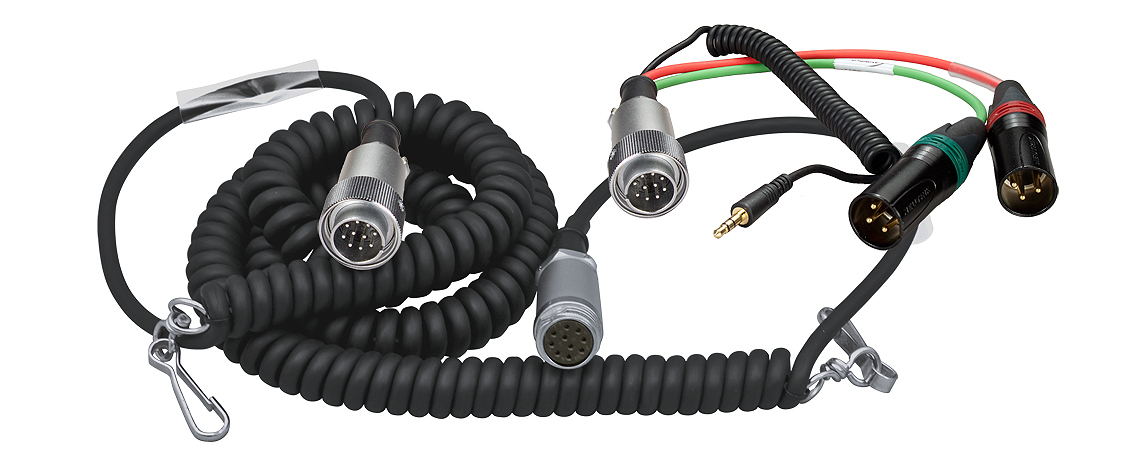 10-pin Hirose male to dual 3-pin XLR male and return via 3.5mm TRS mini plug on coiled cord |