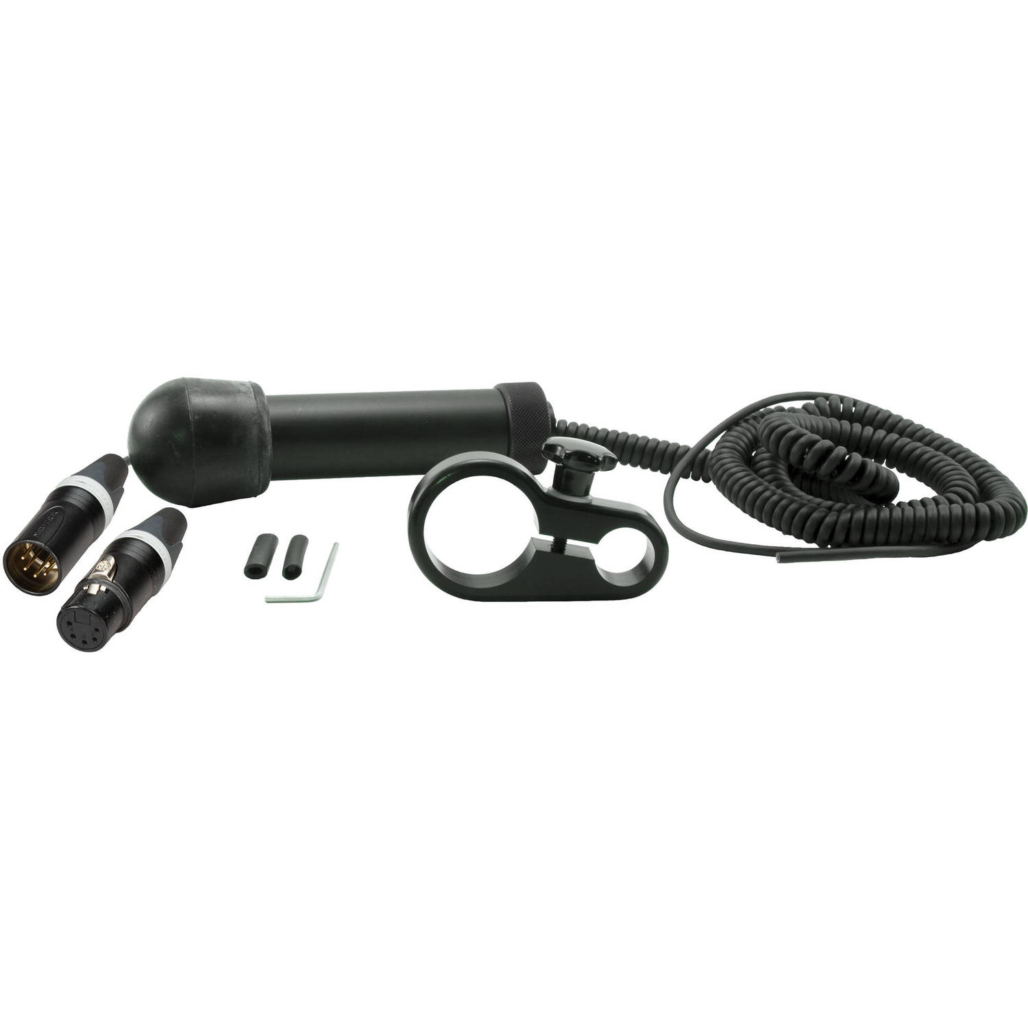 The QXCCS-100 from Ambient Recording is a cable kit featuring a coiled cable and two 5-pin stereo XLR connectors for the QX 5100 quickpole light boom pole. The cable goes through a side outlet in the pole. The kit includes an inner cable strain relief made out of POM, a base made out of POM with two threaded holes, two grub-screws M4 and a matching Allen key, an outer shell made from anodized aluminum, a knurled ring nut for mounting on to the boom, a rubber bumper, a rubber sleeve, and a heat-shrinkable sleeve.