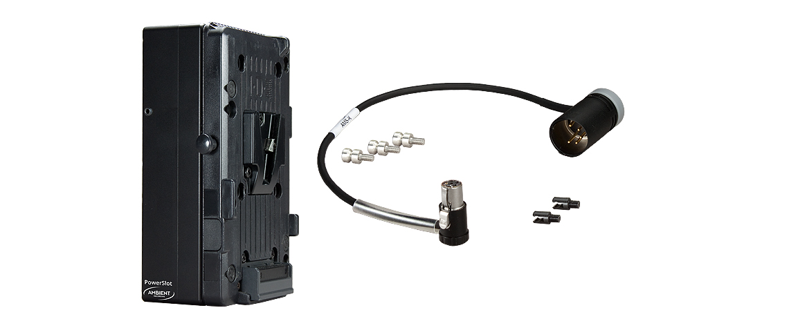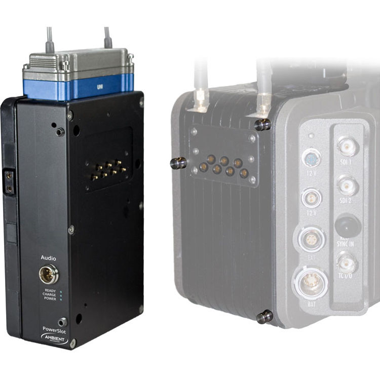 Only few professional video cameras also offer a possibility for slide-in radio receiver. The Ambient Recording PowerSlot chassis provides the solution for the renowned ARRI AMIRA camera. The module is fastened between camera and battery, directly interfacing with the camera, and forms a permanent joint with minimal alteration of the balance. The power is looped through to the camera, powering the receiver. Therefore the module also replaces the battery mount of the camera. The PowerSlot is available as V-Slot (AMS-V) and Anton Bauer (Gold Mount) version (AMS-AB), both equipped with a D-Tap connector to power external devices.