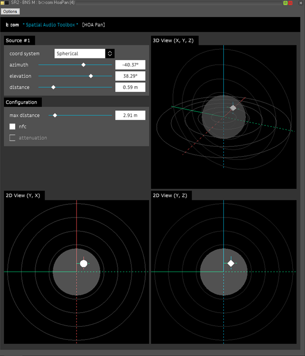 The [HOA Pan] plugin is a key element of the b<>com *Spatial Audio Toolbox*. It lets you pan dynamically mono, stereo or surround sources into a HOA encoded 3D sound scene. Additional features allow it to reproduce near-field effect or distance attenuation.