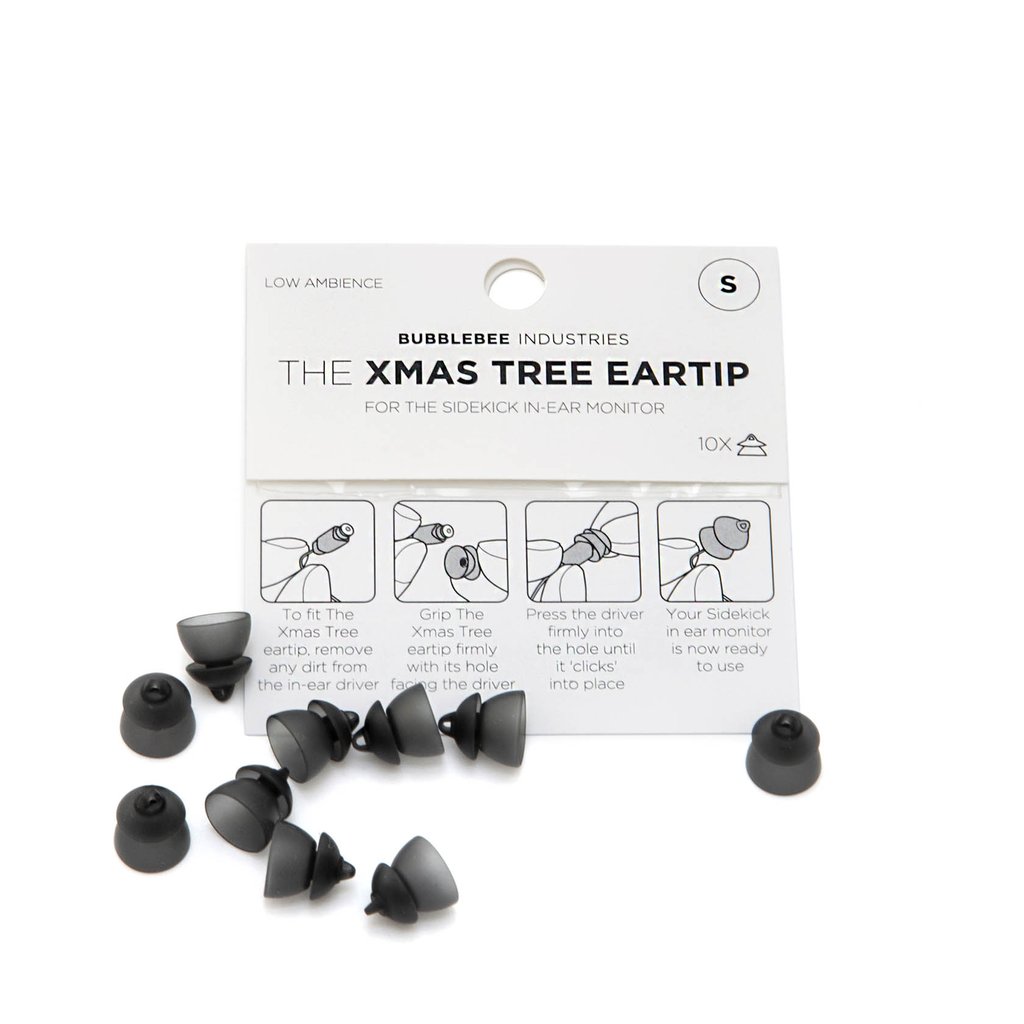The small, 10-pack of The Sidekick Christmas Tree Eartip from Bubblebee is an accessory eartip for the Sidekick In-Ear Monitor (sold separately). This eartip offers comfortable all-day wearability and low ambience of your environment, while still having crystal clear communication delivered to the left, right, or both ears.