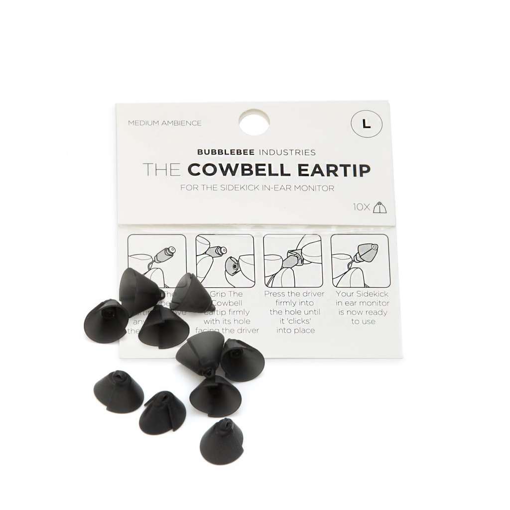 The large, 10-pack of The Cowbell Eartip from Bubblebee is an accessory eartip for the Sidekick In-Ear Monitor (sold separately). This eartip offers comfortable all-day wearability and medium ambience of your environment, while still having crystal clear communication delivered to the left, right, or both ears.