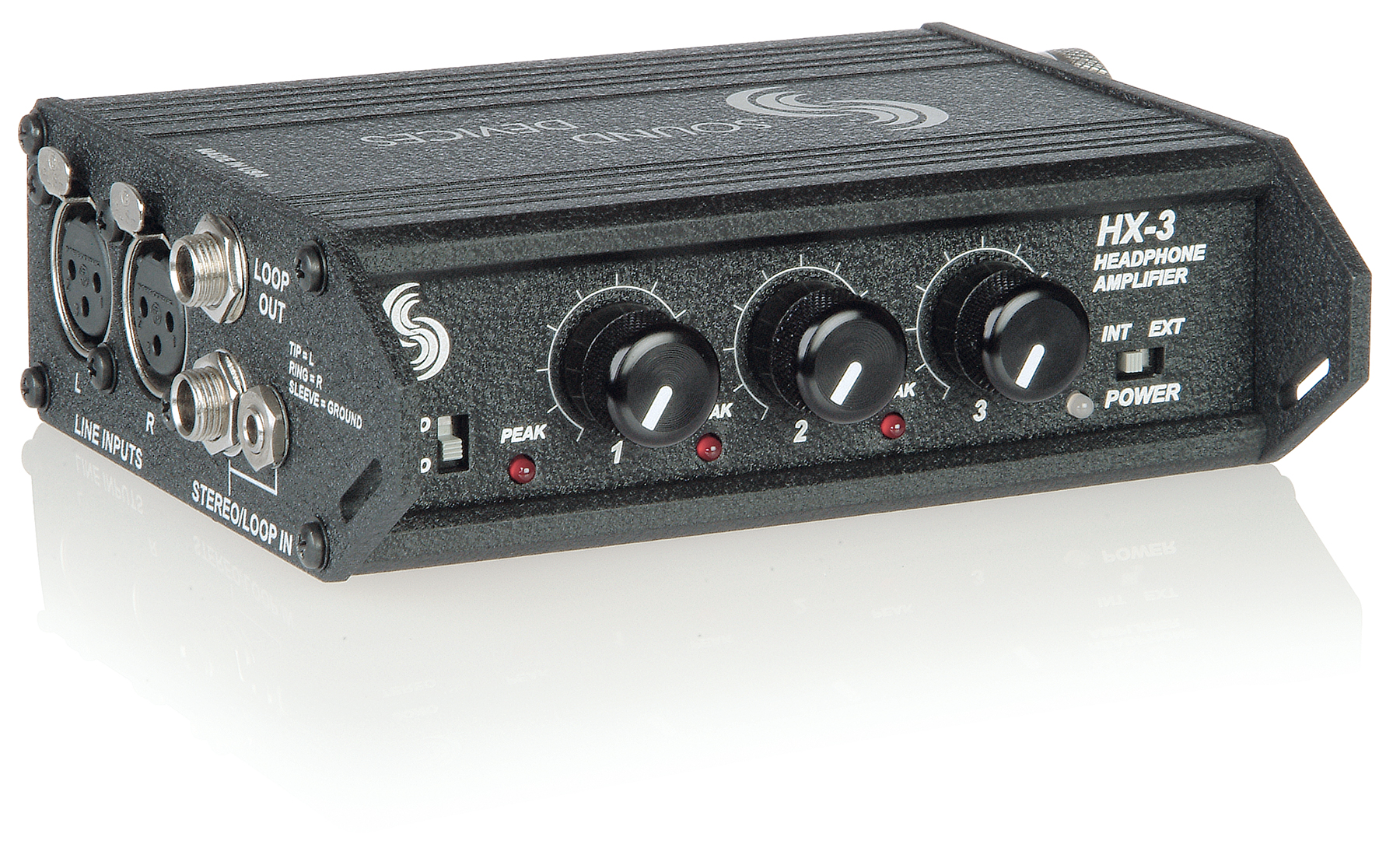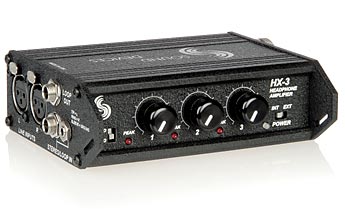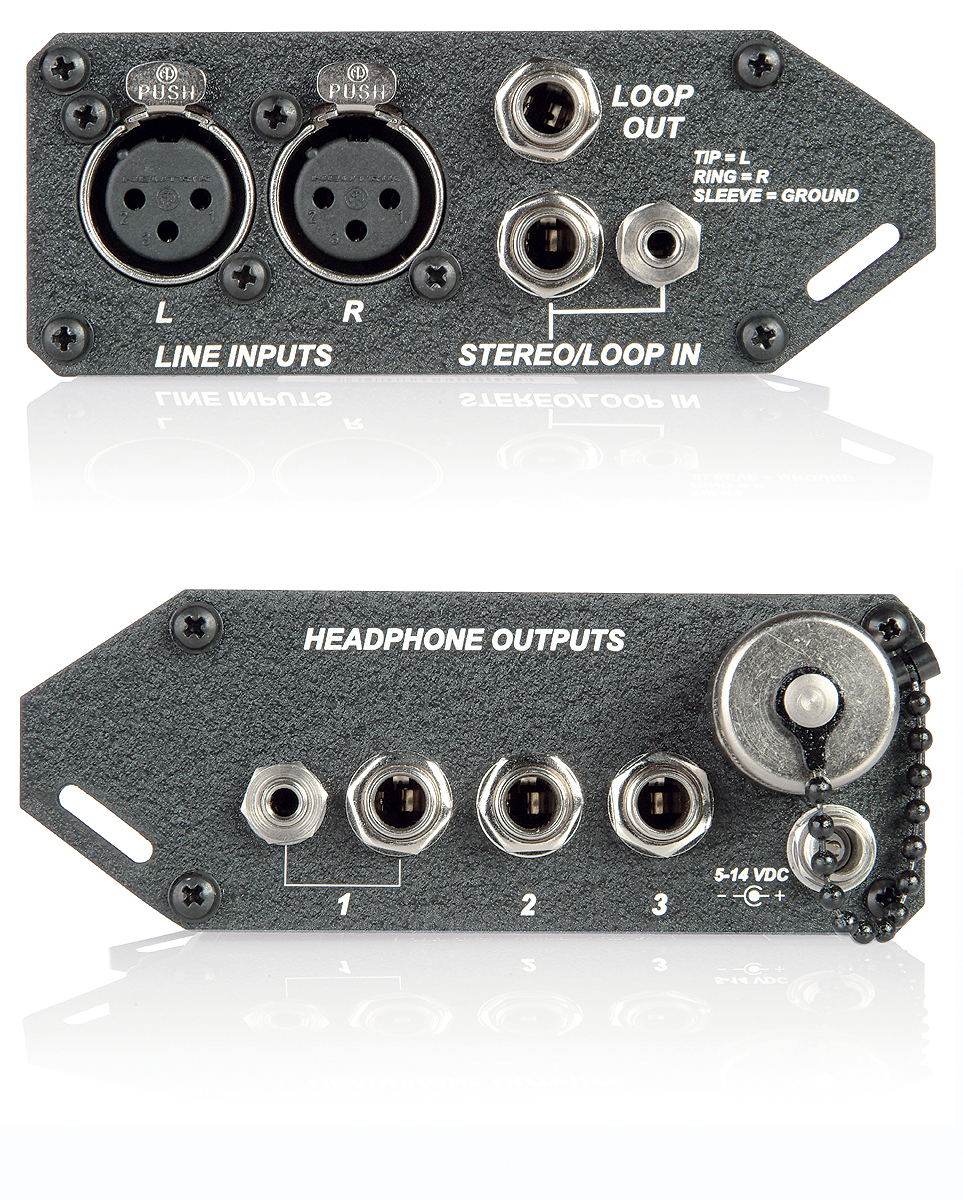 Battery-powered stereo headphone amplifier. Three outputs. Accepts balanced and unbalanced line level inputs. Powered from 2-AA batteries or external DC.