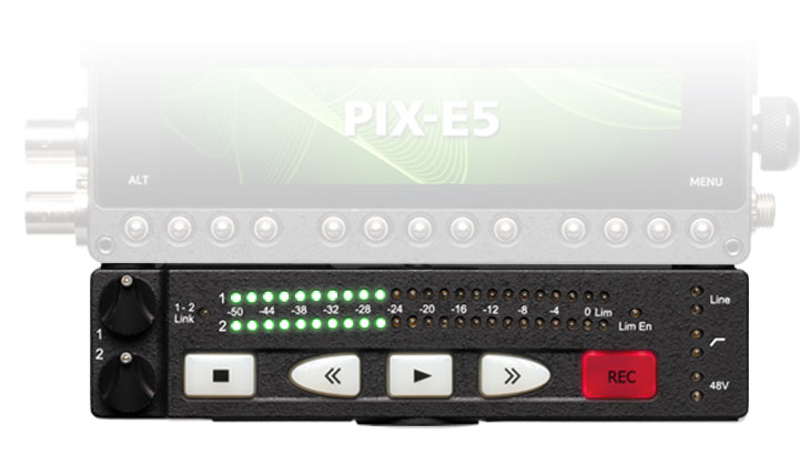 Audio interface that mounts to bottom of PIX-E Monitors via screw-on 1/4" connection. Provides two XLR inputs and outputs, featuring Sound Devices-caliber mic preamps, LED metering and dedicated transport and gain controls.