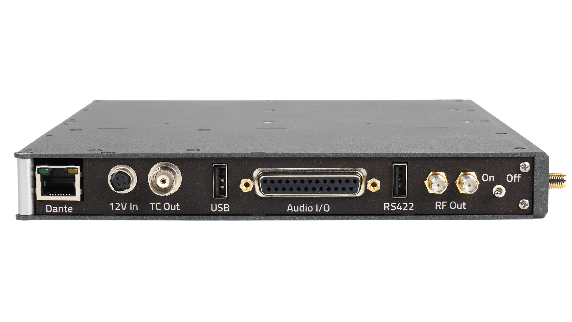 RX-8 can output 8 channels of analog or AES digital audio at 0 dB line-level on the DB25 connector. The RS422 connector pairs with a TRXCL4 or IFB300 to share the ZaxNet remote control commands. It has two SMA RF loop throughs for additional antenna distribution.