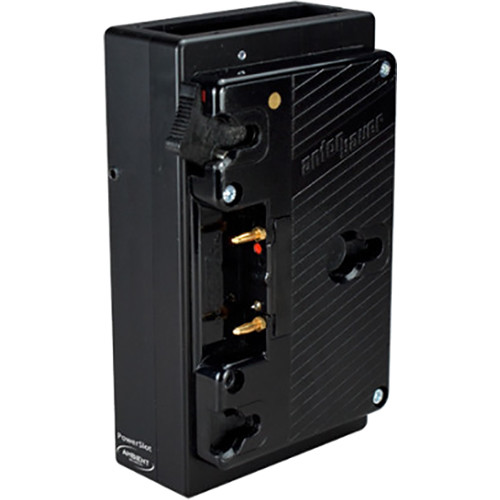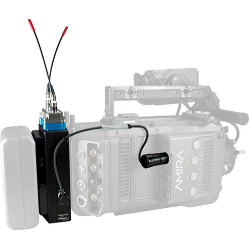 Only few professional video cameras also offer a possibility for slide-in radio receiver. The Ambient Recording PowerSlot chassis provides the solution for the renowned ARRI AMIRA camera. The module is fastened between camera and battery, directly interfacing with the camera, and forms a permanent joint with minimal alteration of the balance. The power is looped through to the camera, powering the receiver. Therefore the module also replaces the battery mount of the camera. The PowerSlot is available as V-Slot (AMS-V) and Anton Bauer (Gold Mount) version (AMS-AB), both equipped with a D-Tap connector to power external devices.