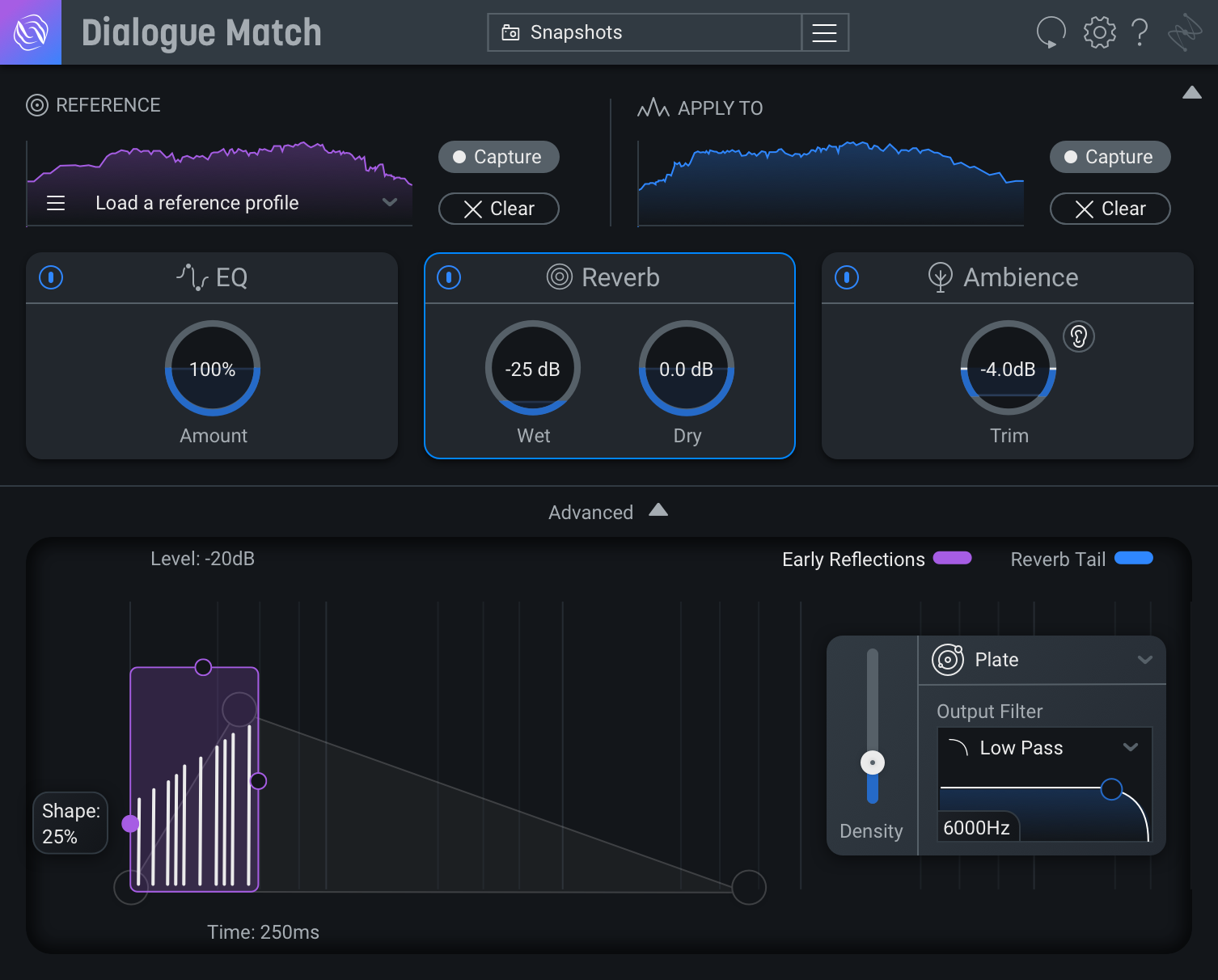 Use the revolutionary new reverb-matching technology of Dialogue Match to duplicate your audio’s EQ, Reverb, and Ambience sonic profiles, then apply them to another clip to place it in the same sonic space as the original.