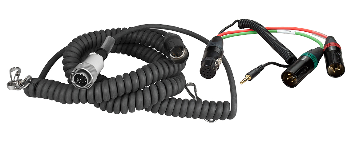 7-pin XLR female to dual 3-pin XLR male and return via 3.5mm TRS mini plug on coiled cord |