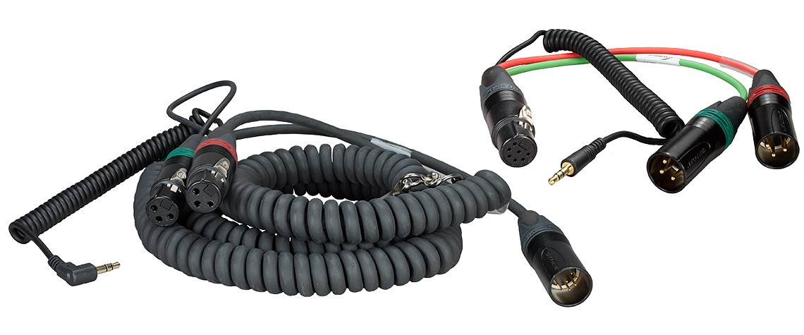 Coiled mixer/camera loom, 2x XLR-3F + 3.5 mm TRS + HBY7-35