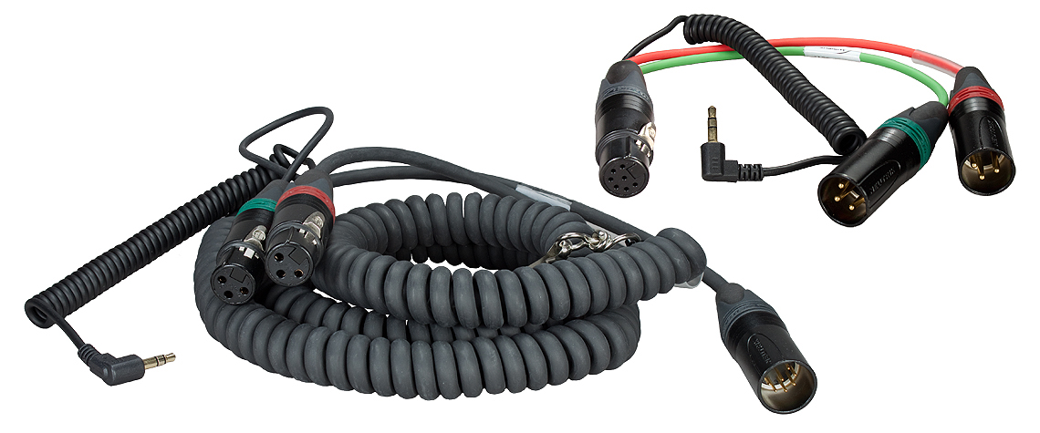Coiled mixer/camera loom, 2x XLR-3F + 3.5 mm TRS + HBY7-35W
