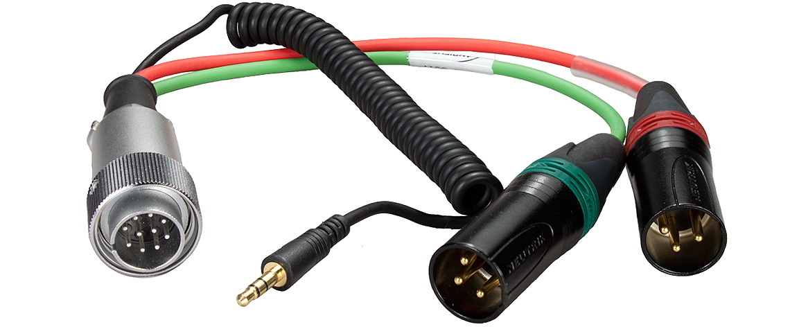 Connector 10-pin Hirose male to dual 3-pin XLR male connector and returns via a TRS mini plug on coiled cord