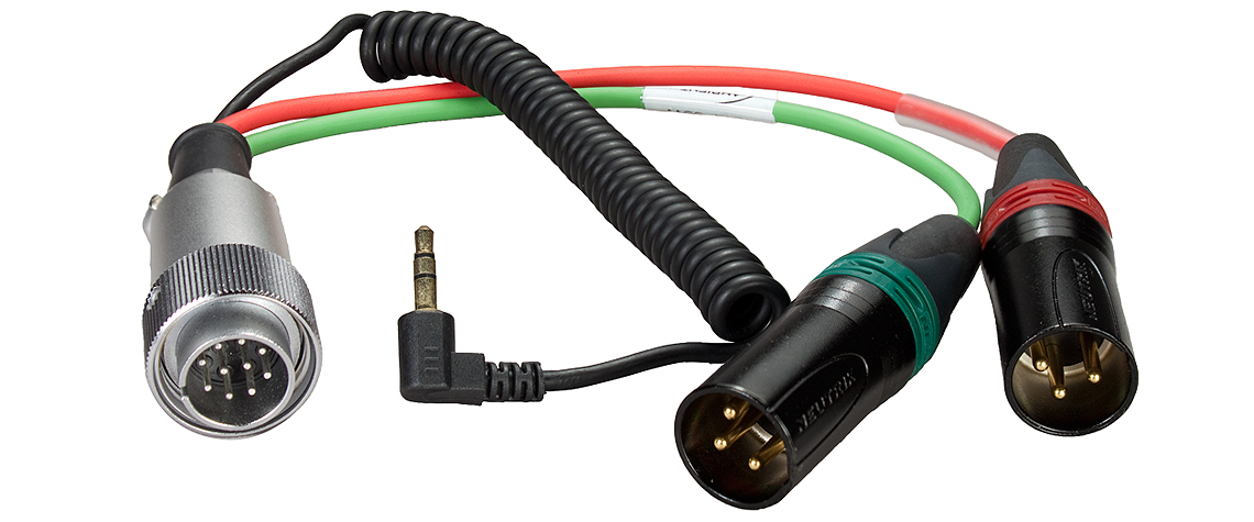 10-pin Hirose male to dual 3-pin XLR male connector and returns via a TRS mini right angle plug on coiled cord |