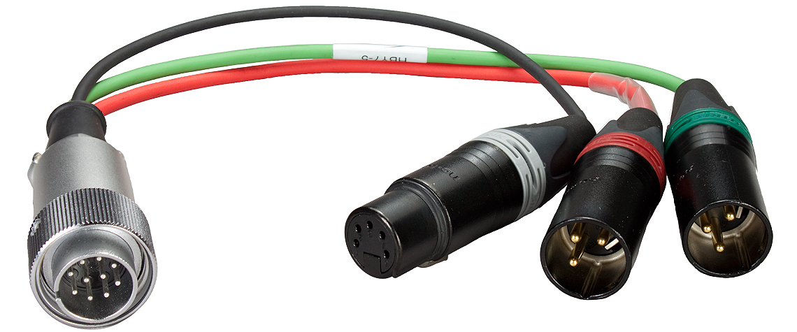 10-pin Hirose male to dual 3-pin XLR male connector and returns via a 5-pin XLR female connector |