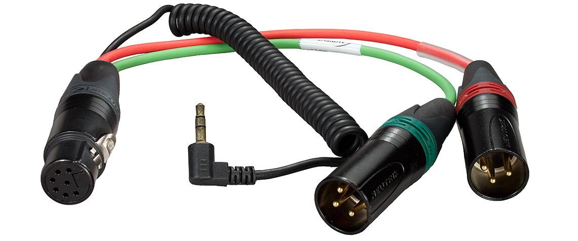 Connector 7-pin XLR female to dual 3-pin XLR male connectors and returns via TRS mini right angle plug on coiled cord