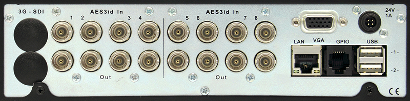 16-ch AES3id (BNC), Ethernet, VGA, 2 x USB 2.0, GPIO, 24 V DC connectors.