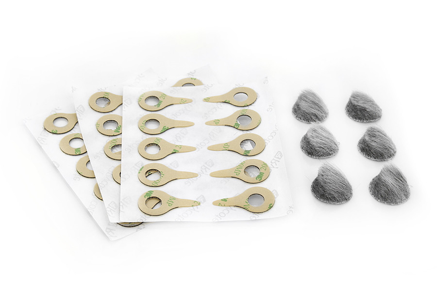 A Mikro-szélvédők egy csomagban 30db öntapadó ragasztót és 6db szürke szőrös lapocskát tartalmaznak.