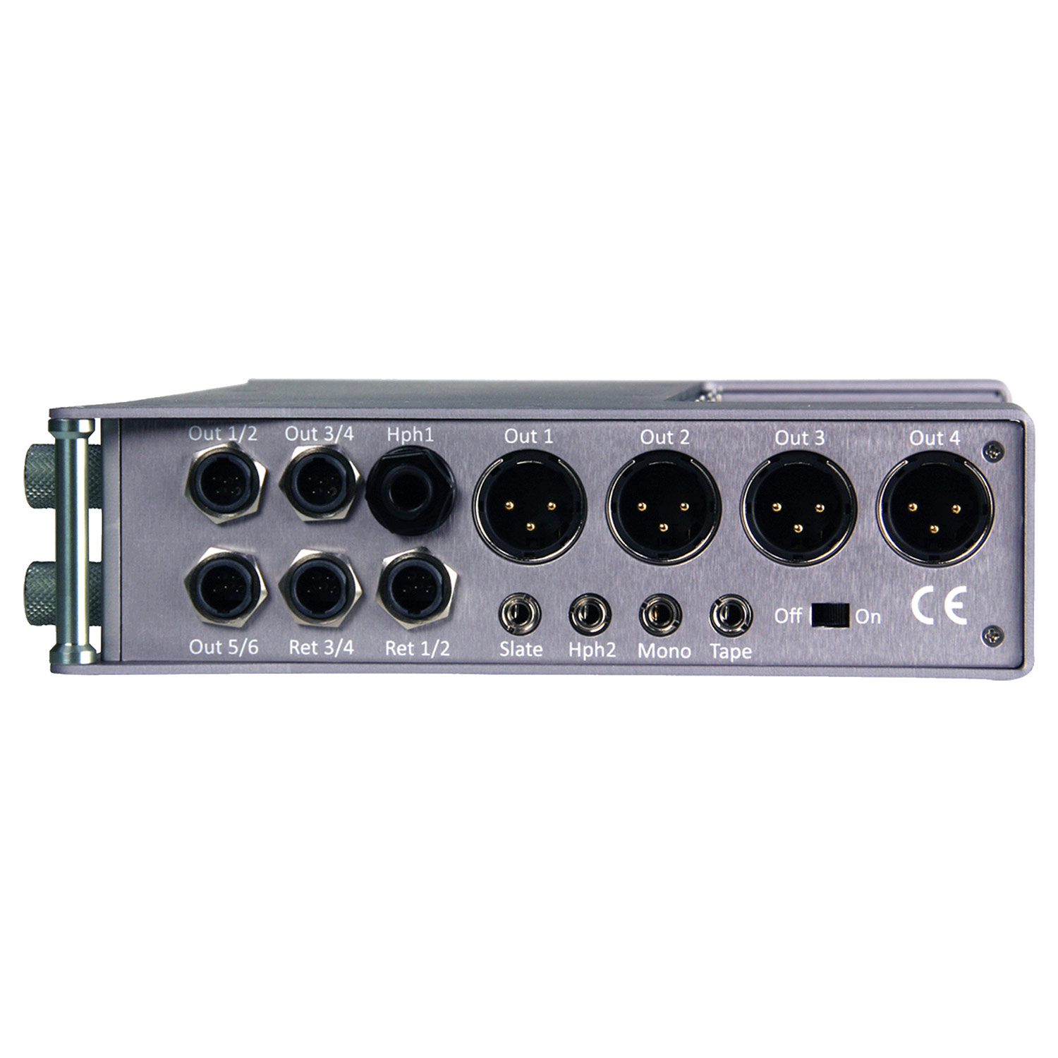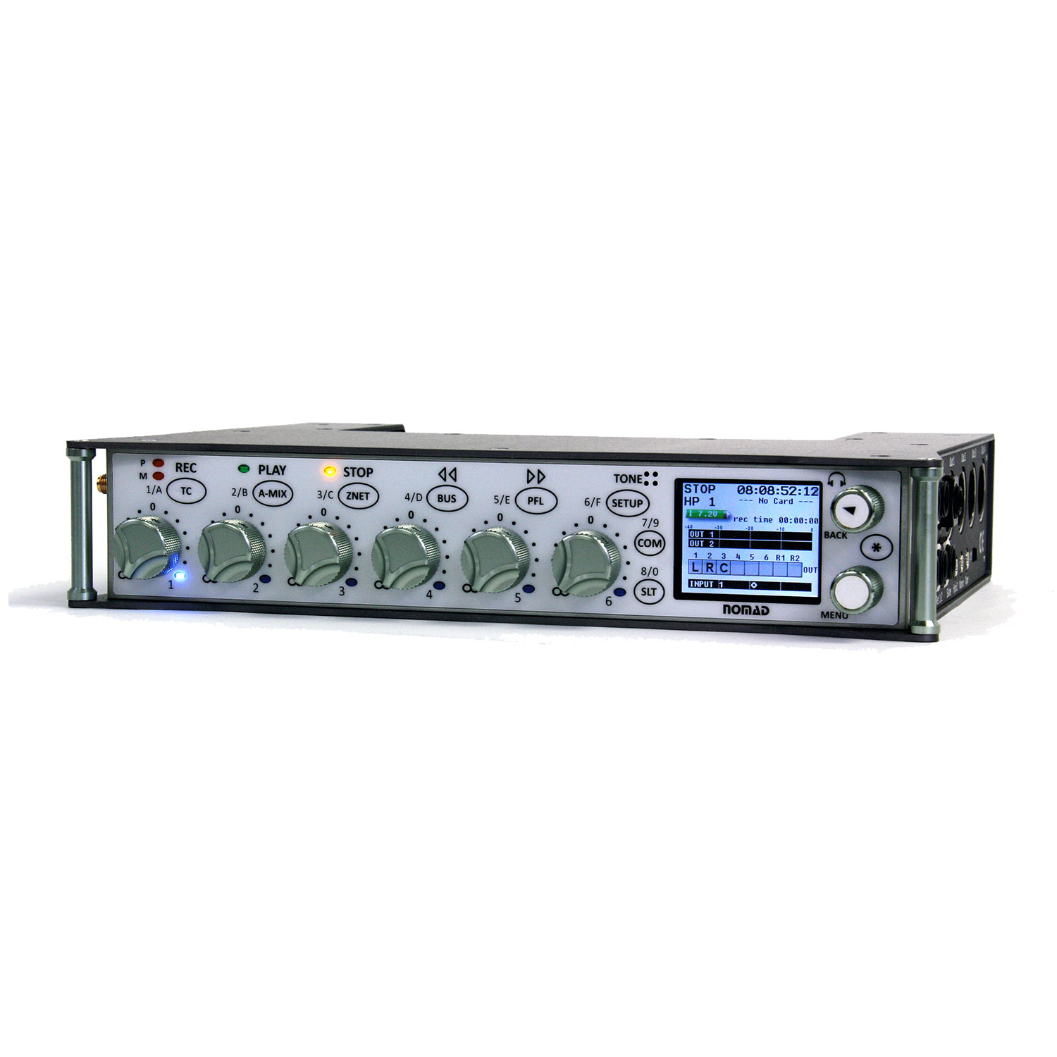 There are three models of Nomad available to fit individual needs – Nomad Lite, Nomad 10 and Nomad 12. All version of Nomad feature 10 analog inputs with 6 mic pre amps featuring NeverClip. Nomad 10 and 12 has 3 pair of AES digital inputs with sample rate conversion. One pair can be configured as an AES42 input. All inputs can be mixed to 6 output buss over 4 XLR connectors and 3 TA5 connectors (two busses per TA5). Each output connectors that can be individually configured as line, mic and consumer output levels. There is also a mono and tape output. Nomad also has 4 balanced camera returns that double as balanced line level inputs. Nomad can record 10 or 12 tracks (model depend) on dual Compact Flash card. Files can be recorded up to 24 bit / 96KHz with a dynamic range of 137 dB. Nomad 10 adds ZaxNet compatibility. Nomad 12 the ability to record to a USB flash drive, and the ability to record MP3 files.
