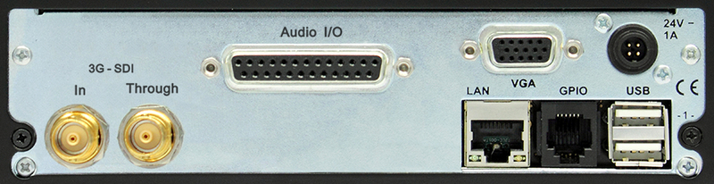 8-ch digital AES3 I/O (Sub-D) and 3G/HD/SD-SDI interface (In, Through, 2 x BNC), Ethernet, VGA, 2 x USB 2.0, GPIO, 24 V DC connectors.