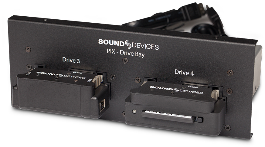 Rack-mount dual PIX-CADDY drive bay for the PIX 270i Rack mount Production Video Recorder . The PIX-DRIVE BAY connects to the PIX 270i with two attached 21” eSATAp cables. This 1/2-rack, 2U chassis requires a PIX-RACK kit for mounting.