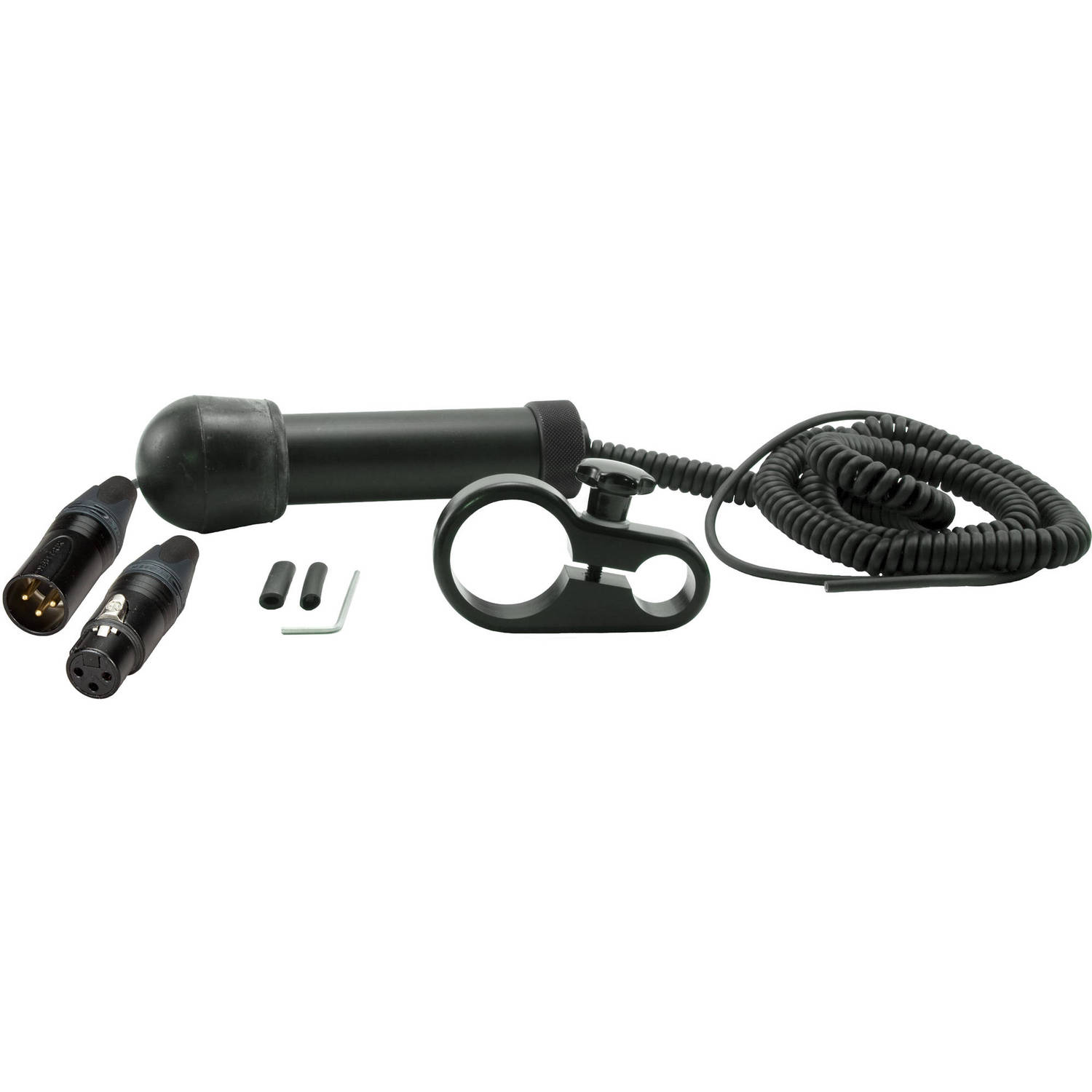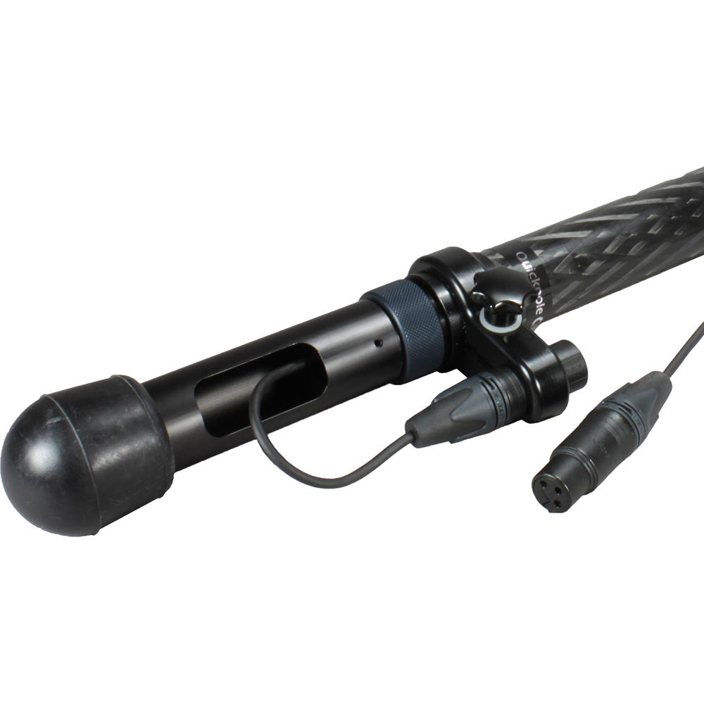 The QXCCM-80 from Ambient Recording is a cable kit featuring a coiled cable and two 3-pin mono XLR connectors for the QX 580 quickpole light boom pole. The cable goes through a side outlet in the pole. The kit includes an inner cable strain relief made out of POM, a base made out of POM with two threaded holes, two grub-screws M4 and a matching Allen key, an outer shell made from anodized aluminum, a knurled ring nut for mounting on to the boom, a rubber bumper, a rubber sleeve, and a heat-shrinkable sleeve.