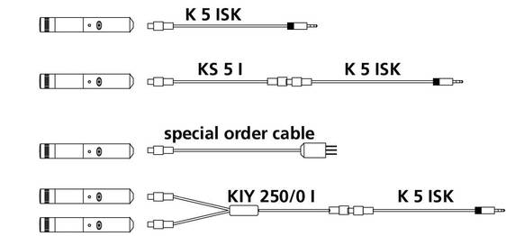 For stereo recordings, there is a Y-shaped cable (KIY 250/0 I) which connects two CMBI to a compact junction box by means of two pieces of cable, each 250mm in length. The short cable leading out of this box has a miniature connector and can be extended either with the K 5 ISK cable or with the extension cable KS 5 I.