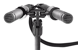In the mid-position (shown at left) the microphones are oriented perpendicular to the microphone stand. The angle of inclination is +90° to -90° from the mid position.
