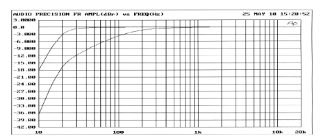 Frequency response curves with (below) and without (above) the switchable low-cut filter