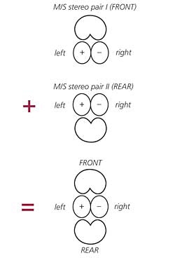 ”Double M/S” is an improved version of the well-known M/S stereo recording technique. In addition to a front-facing cardioid or supercardioid ”mid” microphone and a figure-8 ”side” microphone, a rear-facing directional microphone is set up. The front- and rear-facing microphones share the signal of the figure-8 microphone so as to form two complete, back-to-back M/S systems. One M/S system then provides the three front channels (the center channel signal being provided directly by the mid microphone of the front system), while the other system provides the two surround channels.