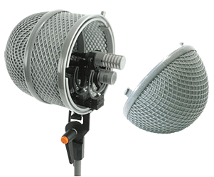 The WSR MS consists of an elastic suspension (AMS_) and a basket-type windscreen with Windjammer. It is intended for one or two small microphones. It allows mono as well as M/S stereo recordings.
