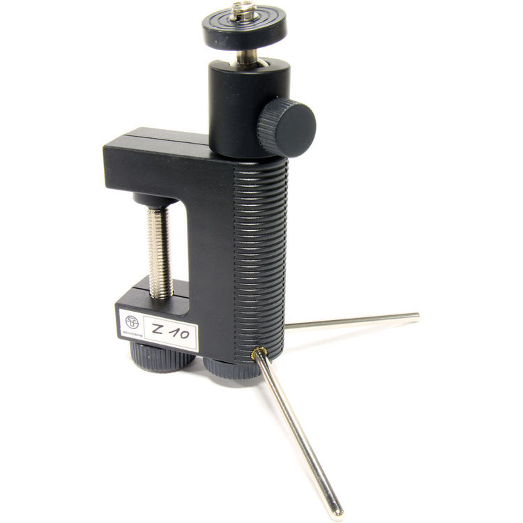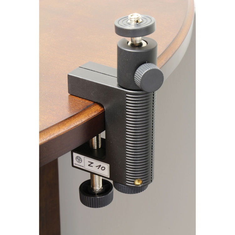 The Z 10 allows microphones or accessory parts to be mounted onto the edge of a table or the like. The Z 10 allows microphones or accessory parts to be mounted onto the edge of a table or the like. It can also grasp tubular shapes; its pressure pad is grooved for this purpose. It can be used as a miniature tripod table stand as well.