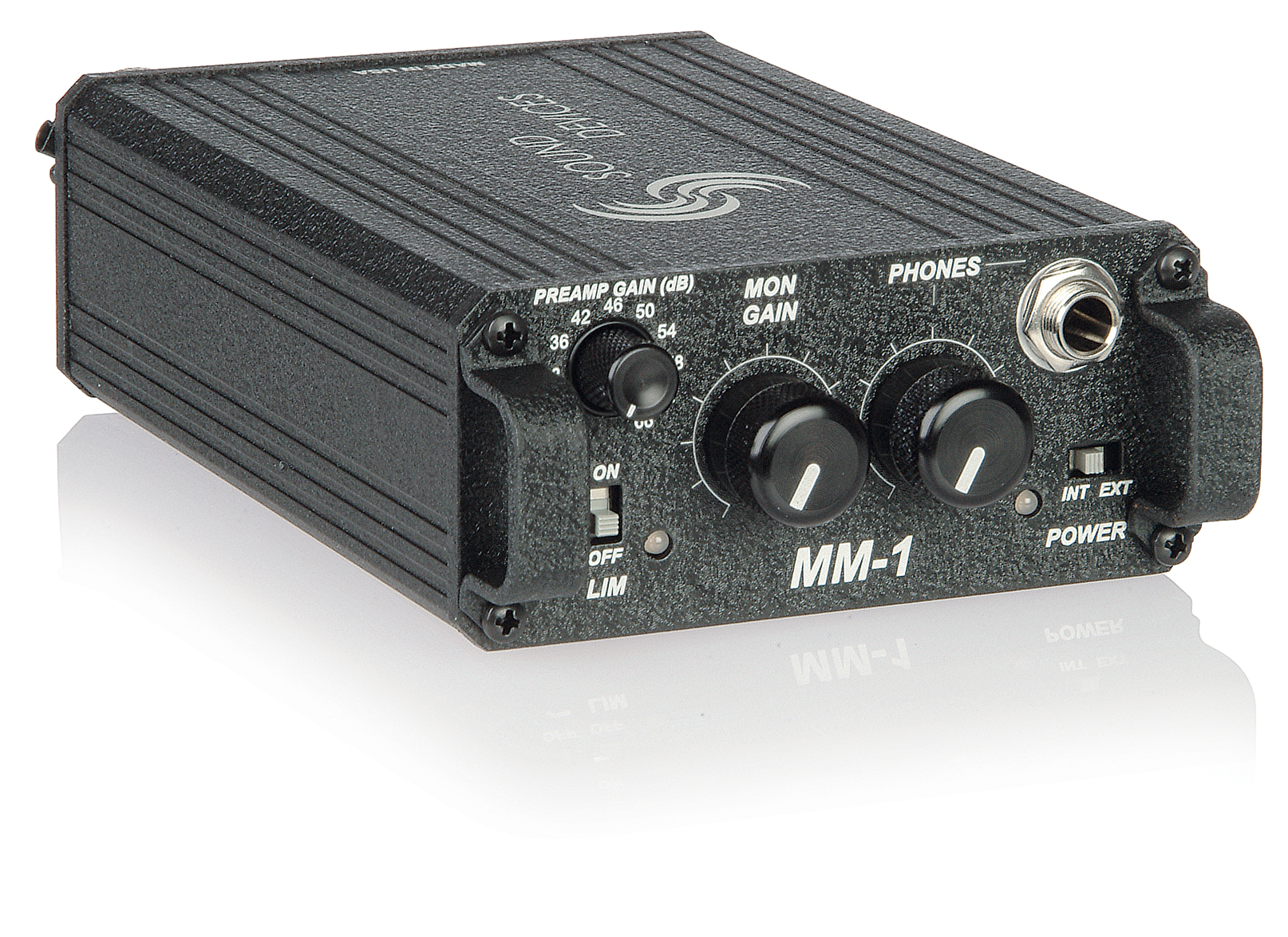 Battery-powered microphone preamplifier with headphone monitoring. 48 V phantom and T-power, limiter, high-pass filter. 2-AA or external DC powered.