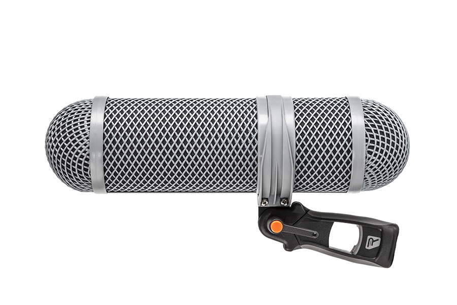 The Super-Shield Windshield is made up from two “pods” which attach to the central chassis. They are lightweight, durable baskets made from flexible grey plastic netting with a screening material attached. The windshield has a twist lock system onto the suspension chassis ring, and when fitted completely surround the whole microphone, connector and suspension. This system creates a still volume of air around the microphone, which provides excellent wind-noise reduction, with minimal High-Frequency loss.