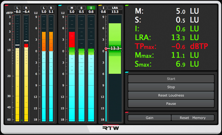 RTW Loudness Tools feature Metering and Loudness display for mono, stereo, multichannel, and surround applications (8 channels max.) and all standard sampling rates up to 96 kHz including all widely used PPM and TruePeak measurements and scales.