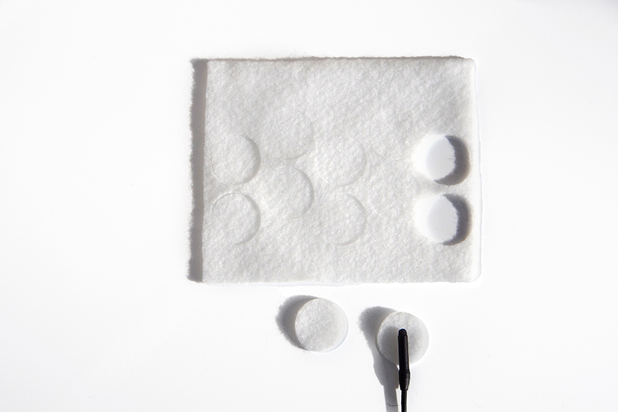 Using Stickies to affix the microphone, a soft fabric disc is then added on top to minimise the sounds of clothing rustle and low wind noise.