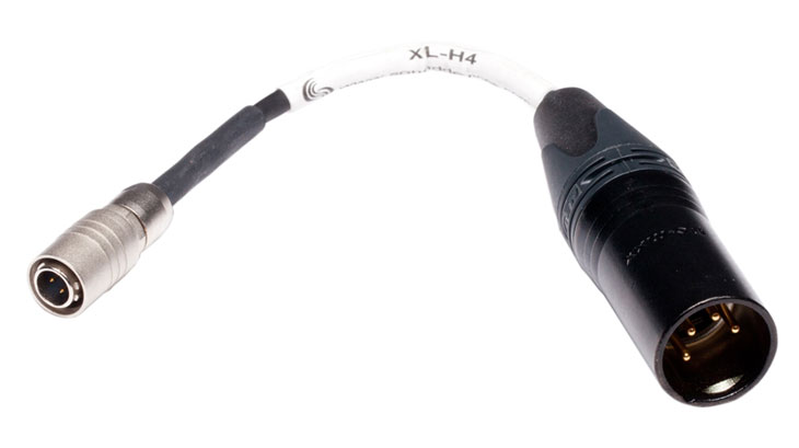 The Sound Devices XL-H4 Power Adaptor Cable connects a power adaptor with a 4-pin XLR-M connector to a device which has a 4-pin Hirose connection. It measures 6” (15.24cm) in length.