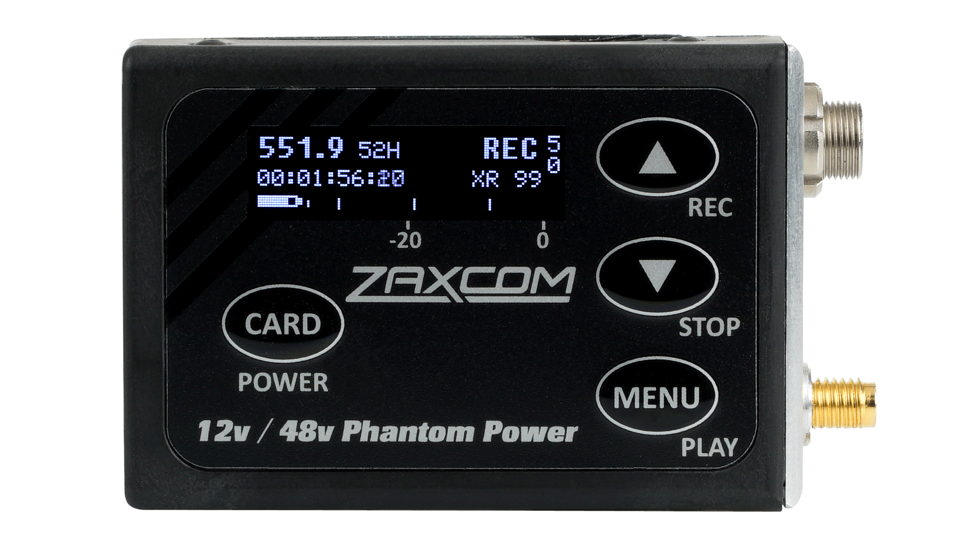 The ZMT3-Phantom provides a 114dB dynamic range with no limiting or compression distortion. Phantom power is selectable in 12, 24, 32 and 48V. External audio and battery status levels are easily visible for the operator.