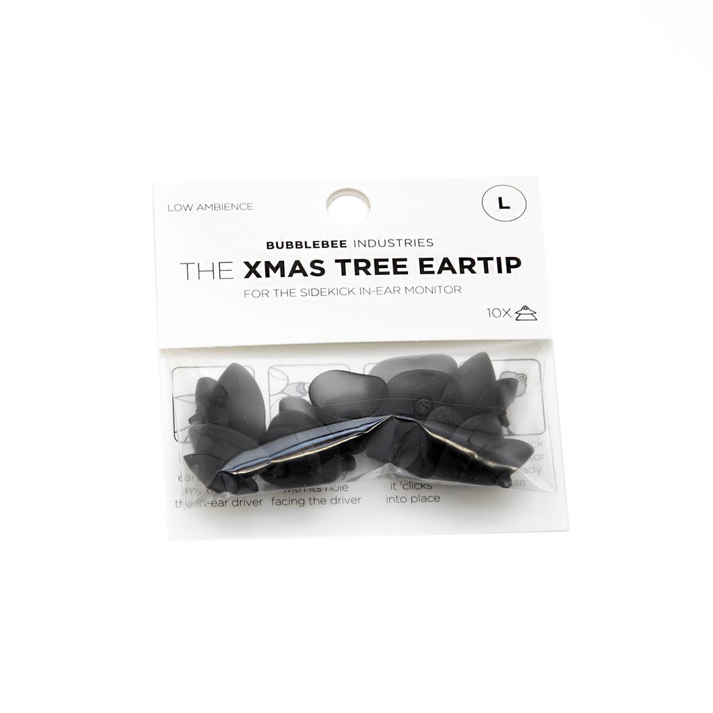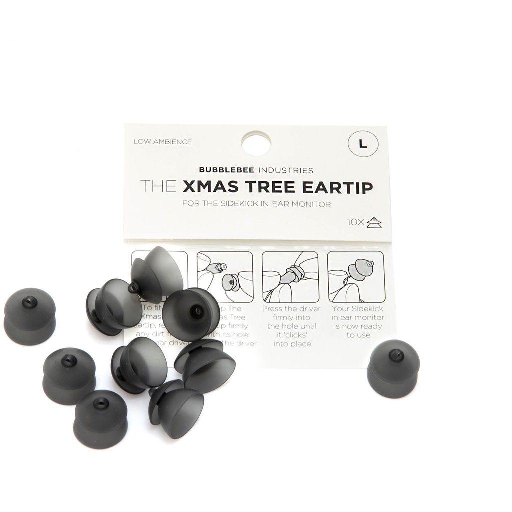 The large, 10-pack of The Sidekick Christmas Tree Eartip from Bubblebee is an accessory eartip for the Sidekick In-Ear Monitor (sold separately). This eartip offers comfortable all-day wearability and low ambience of your environment, while still having crystal clear communication delivered to the left, right, or both ears.