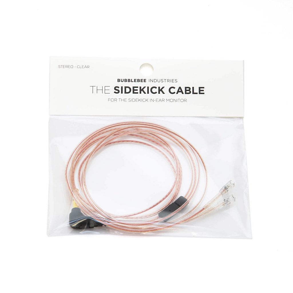 The clear stereo variation of The Sidekick Cable from Bubblebee is an accessory cable for the Sidekick In-Ear Monitor (sold separately). This cable is Kevlar reinforced making it super strong and durable. The Sidekick cable loops behind the ears so that it's easily concealable under hair and clothing. In addition, the cable is 48" long and splits to the left and right ear from a single 3.5mm mini-jack.