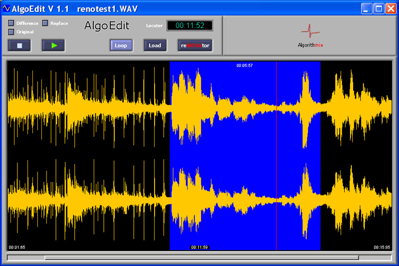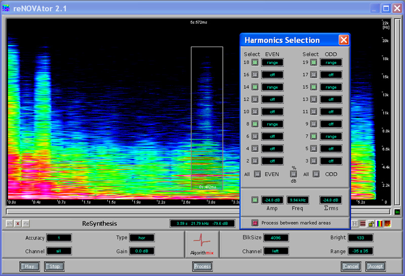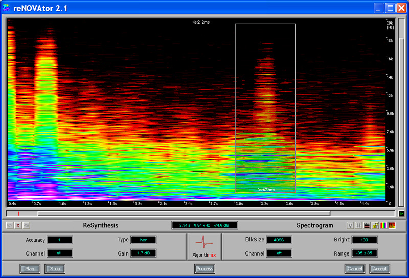 reNOVAtor uses several unique denoising techniques developed by Algorithmix between 1997 and 2001. The selected part of an audio signal including disturbing sounds is first converted to its spectral representation and mapped to a color-coded spectrogram. Then the algorithm determines the amplitudes of each spectral beam at the edges of marked area and calculates parameters for a denoisig process working on each single beam within the selection. The user can control the overall behavior of the noise remover using global parameters determining denoising thresholds for the disturbances in each spectral beam of the processed area. It works like an adaptive linear-phase multiband compressor (up to 16384 bands) or an inverse noise gate, following psychoacoustic model of masking. The noise removal may even be restricted to certain gain ranges within the selected area, which is very useful if only certain components of the signal need to be treated (e.g. a specific harmonic). Functions for automatic detection of clicks and spikes, as well as identification of tones and harmonics are also provided.