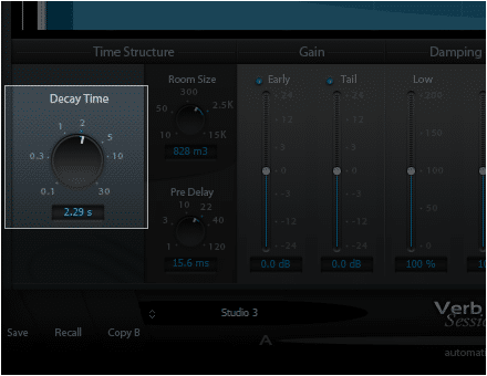 - Decay Time adjusting the duration of the reverberation tail in seconds.