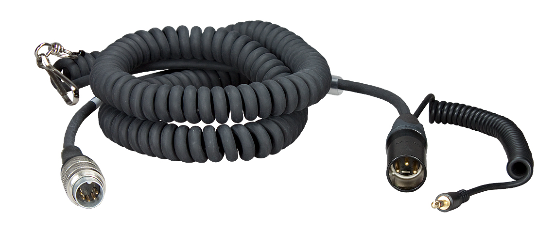 The 4.5 to 16.4' HBS-SQN3 Coiled Breakaway Cable for SQN3 from Ambient Recording comes with a Tuchel 5-pin male to 3-pin XLR male connector and return via TRS mini plug on coiled cord for SQN3.