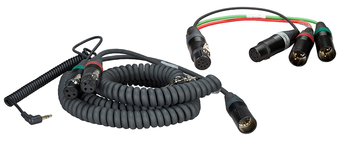 Coiled mixer/camera loom, 2x XLR-3F + 3.5 mm TRS + HBY7-5