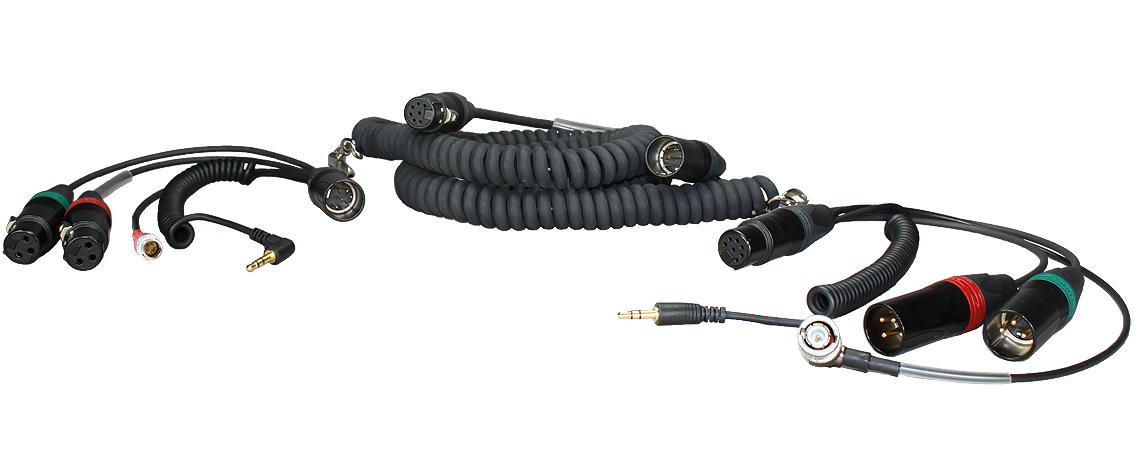 7-pin XLR female to 2x 3-pin XLR male, return via 3.5 mm TRS plug on coiled cord and cable with BNC right angle for timecode from Sound Devices 664 / 633 mixer to camera, return mono