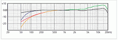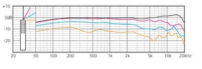 Frequency response curves: without filter (black), with steep low cut 80 Hz, 18 dB/oct. (blue), with gentle low cut 300 Hz, 6 dB/oct., with high frequency emphasis of +5 dB at 10 kHz